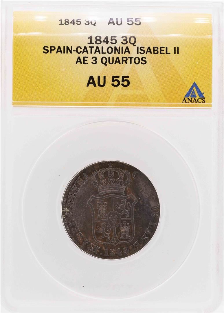 One 1845 Spain-Catalonia Isabel II AE 3 Quartos Coin ANACS AU55. ANACS Certified.