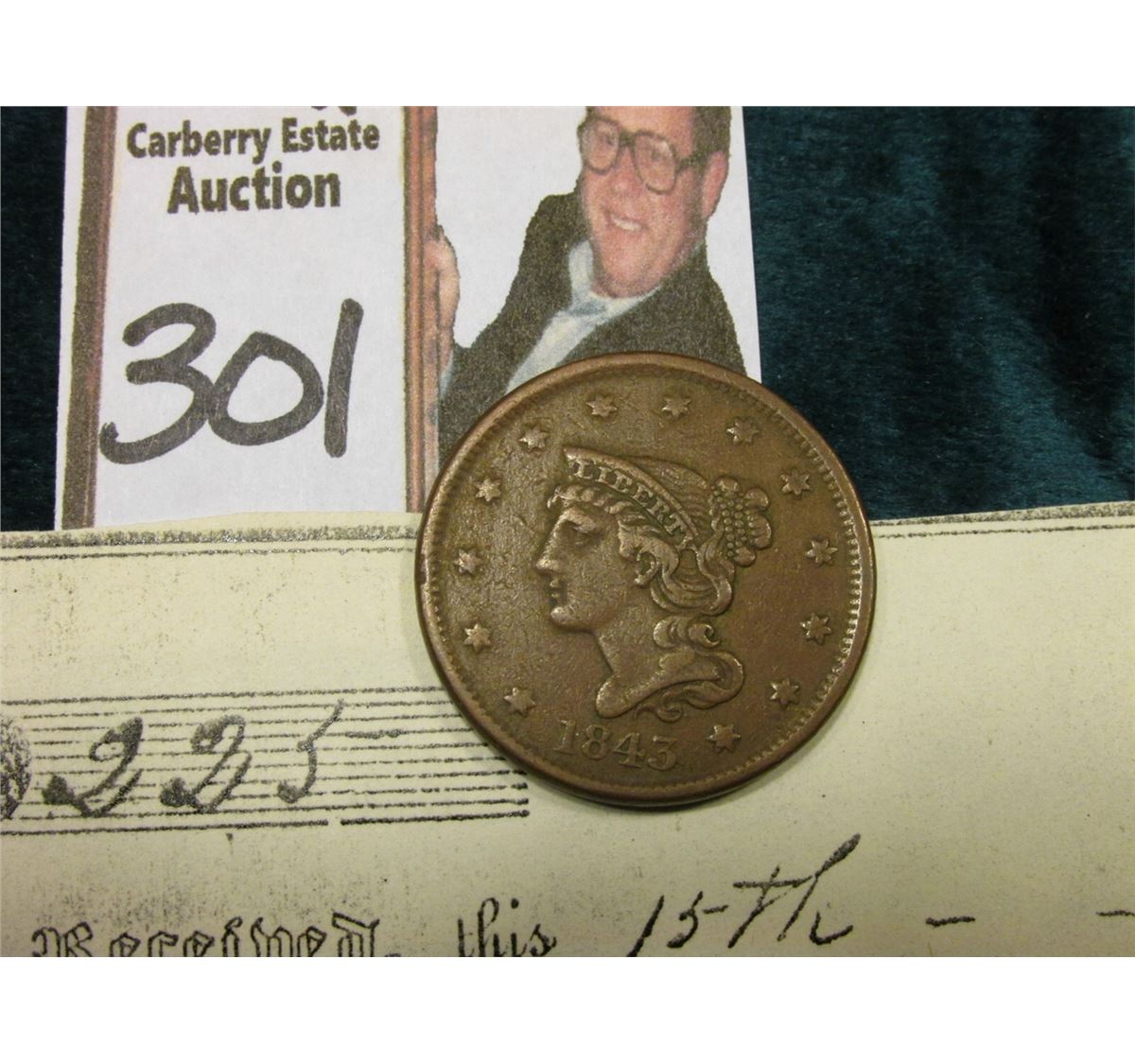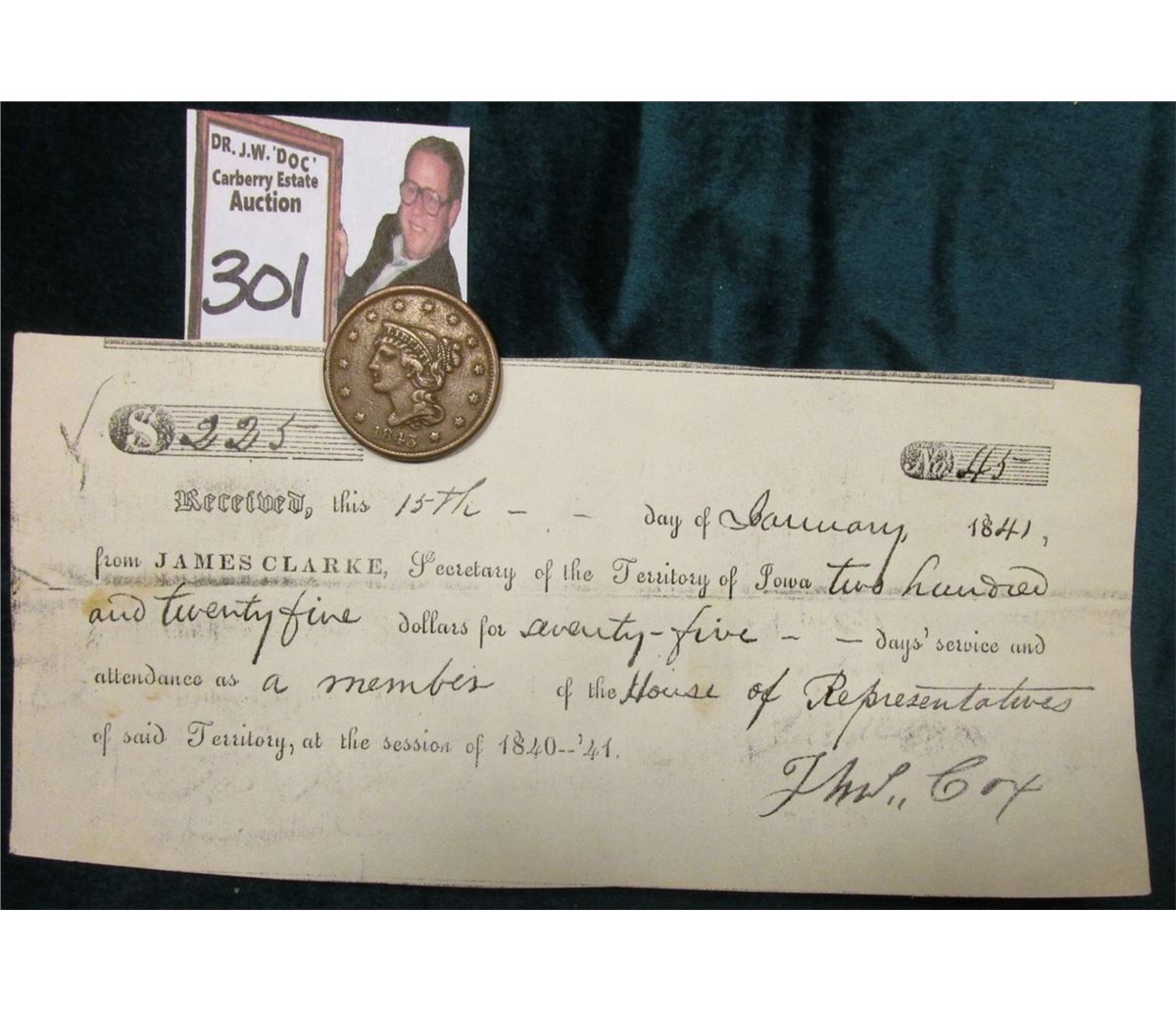 1845 U.S. Large Cent & Jan. 15th, 1841 receipt from James Clarke, Secretary of the Territory of Iowa Two Hundred and Twenty Five Dollars for seventy-five days service and attendance as a member of the House of Representatives of said Territory, at the session of 1840--'41 JW..Cox"