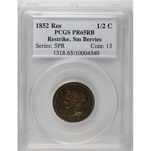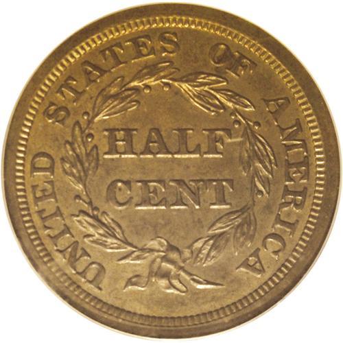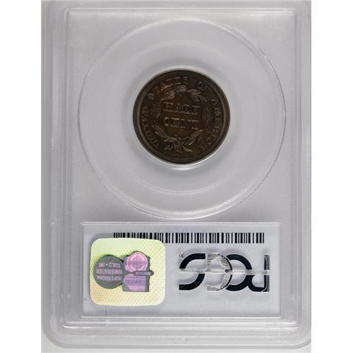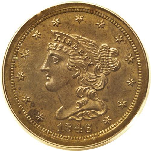 <B>1846<1/2 C> Original PR63 Brown PCGS.</B></I> B-1, R.6. The obverse of this date has hand-engraved numerals in the date with an entirely different appearance from those of nearby dates. Sharply struck with pleasing light tan surfaces and reflective fields. Several small spots and blemishes are visible on each side and the obverse has a larger spot at the border, touching star 1. EAC PR60.