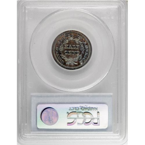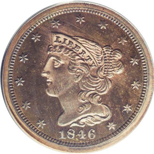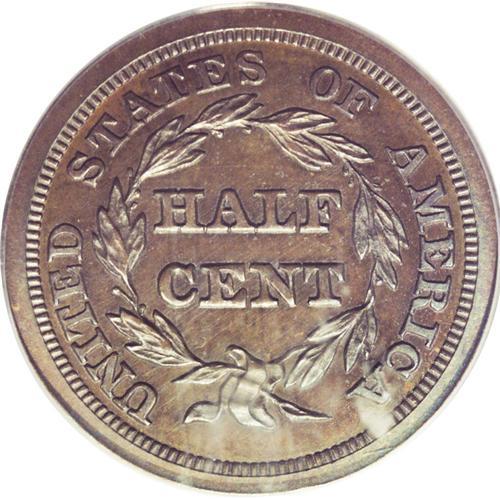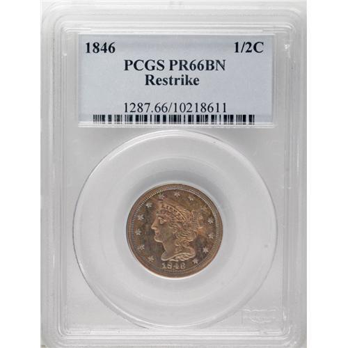 <B>1846 1/2 C Restrike PR66 Brown PCGS.</B></I> More specifically, this is a Second Restrike, as seen by the small berries and die file marks over RICA on the reverse. Breen (1983) rates the Second Restrikes as R.6. In his half cent reference he had only seen two pieces and knew of four others that were in private collections. The Second Restrikes and the Originals are roughly equivalent in scarcity, while the First Originals are considered a High R.7. This is a magnificent piece, as are all proof half cents and large cents. The wide, squared-off rims and brightly reflective fields set this piece apart as distinctly different from any well-produced circulation strike. While labeled as a Brown coin, the obverse displays significant underlying mint red. The reverse is a uniform teal-blue with bits of brown interspersed. As one would expect from a coin in this grade, the surfaces are essentially perfect. There are significant die striations in the fields which help impart the bright reflectivity on each side. EAC PR60. Population: 2 in 66, 0 finer (10/06).<BR><BR><b>Shipping:</b> Coin/Currency (<a target="_blank" href="http://www.heritageauctions.com/common/shipping.php">view shipping information</a>)