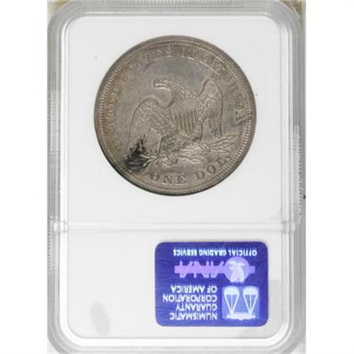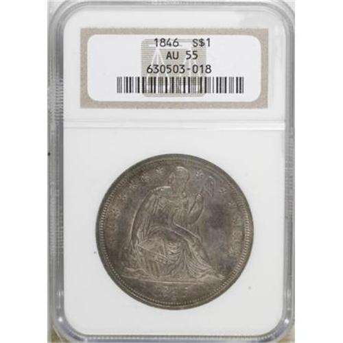 <B>1846 $1 AU55 NGC.</B></I> A deep layer of orange-brown toning blankets each side of this example. The 1846 Seated dollar had a typically low mintage for the type of 110,600 coins, and Mint State survivors are scarce, making this Choice AU specimen a more affordable alternative for the date collector. <BR><BR><B>Coin Engraver:</B> Christian Gobrecht<BR><BR><b>Shipping:</b> Coins & Currency (<a target="_blank" href="http://www.heritageauctions.com/common/shipping.php">view shipping information</a>)