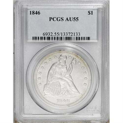 <B>1846 $1 AU55 PCGS.</B></I> PCGS Population (51/117). NGC Census: (48/144). Mintage: 110,600. Numismedia Wsl. Price for NGC/PCGS coin in AU55: $765. (#6932)<BR><BR><B>Coin Engraver:</B> Christian Gobrecht<BR><BR><b>Shipping:</b> Coins & Currency (<a target="_blank" href="http://www.heritageauctions.com/common/shipping.php">view shipping information</a>)