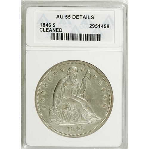 <B>1846 $1 --Cleaned--ANACS. AU55 Details.</B></I> NGC Census: (46/142). PCGS Population (48/109). Mintage: 110,600. Numismedia Wsl. Price: $700. (#6932)<BR><BR><b>Shipping:</b> Coins & Currency (<a target="_blank" href="http://www.heritageauctions.com/common/shipping.php">view shipping information</a>)