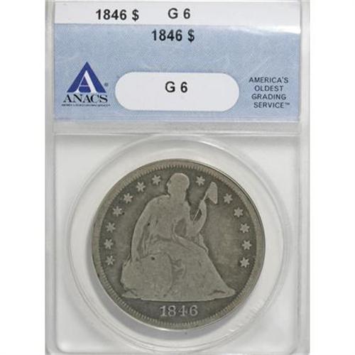 <B>1846 $1 G6 ANACS.</B></I> NGC Census: (0/333). PCGS Population (1/394). Mintage: 110,600. Numismedia Wsl. Price for NGC/PCGS coin in G6 : $184. (#6932)<BR><BR><B>Coin Engraver:</B> Christian Gobrecht<BR><BR><b>Shipping:</b> Coins & Currency (<a target="_blank" href="http://www.heritageauctions.com/common/shipping.php">view shipping information</a>)