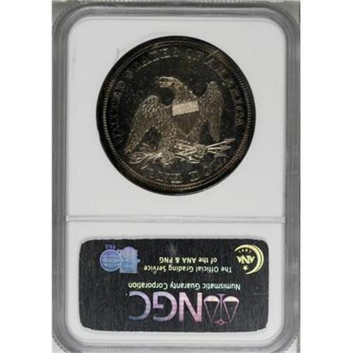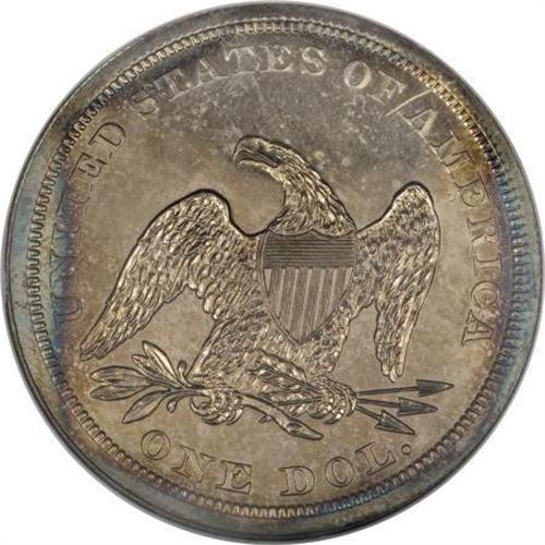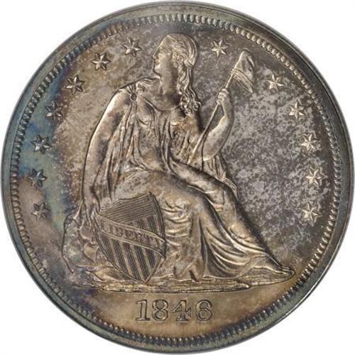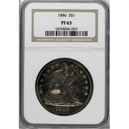<B>1846 $1 PR63 NGC.</B></I> Breen-5426, a proof-only variety that he considered to be very rare. The date is widely repunched. The date was first entered too low and slanted slightly downwards. It was largely effaced, then repunched level but slightly high. Obvious traces of the initial logotype are present near the bases of the 846, such as the diagonal and crosslet of the 4, and the upper portion of the closed loop of the 6.<BR> Breen (1988) and Bowers (1993) list two varieties of proof 1846 Seated dollars. The other proof variety shows no repunching of the date. Bowers adds, "about a half dozen specimens, including the National Coin Collection [Smithsonian] coin, are known to Walter H. Breen."<BR> But according to Duncan Lee, in an August 2006 supplement to the Coin Dealer Newsletter, "all known proofs of this year [1846] are restrikes and have [a] dramatically recut date." Lee is incorrect, since a normal date 1846 proof did appear in our 2007 FUN Signature auction as lot 1062. The date is set slightly further to the right relative to the blundered date variety, with the left edge of the upright of the 1 aligned with the shield point. The present blundered date specimen has the upright of the 1 centered beneath the shield point.<BR> This brings up another question. The blundered date proofs use the usual shared reverse of 1840 to 1850, identified by die lumps on each side of the center of the right upright of the final A in AMERICA. What about the normal date proofs? The images for the aforementioned lot 1062 are high quality and show no evidence of lumps on the A.<BR> The present shared reverse, blundered date 1846 proof is attractively toned in caramel-gold, with glimpses of ocean-blue and plum-mauve near the rims. A brief thin mark is noted on the reverse at 1 o'clock, and there is a pair of subtle spots on the field near Liberty's knees. Otherwise, it is an outstanding, fully struck example of this desirable proof date. Census: 3 in 63, 9 finer (2/08).<BR><I>Ex: Amon G. Carter, Jr. Collection (Stack's, 1/1984), lot 252.<BR>From The Queller Family Collection of Silver Dollars.</B></I><BR><BR><B>Coin Engraver:</B> Christian Gobrecht<BR><BR><b>Shipping:</b> Coins & Currency (<a target="_blank" href="http://www.heritageauctions.com/common/shipping.php">view shipping information</a>)