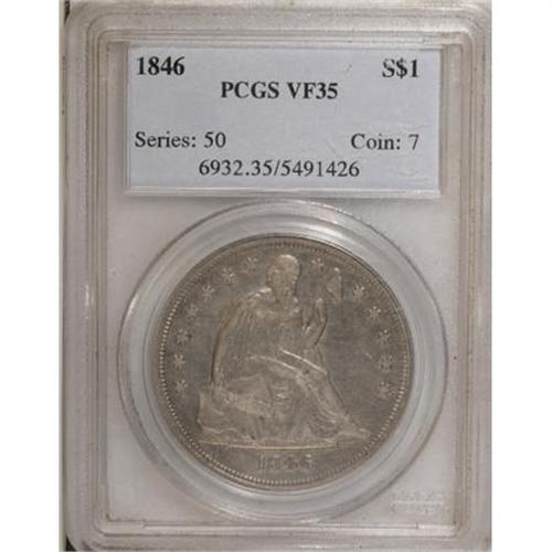 <B>1846 $1 VF35 PCGS.</B></I> PCGS Population (20/353). NGC Census: (6/311). Mintage: 110,600. Numismedia Wsl. Price for NGC/PCGS coin in VF35: $363. (#6932)<BR><BR><B>Coin Engraver:</B> Christian Gobrecht<BR><BR><b>Shipping:</b> Coins & Currency (<a target="_blank" href="http://www.heritageauctions.com/common/shipping.php">view shipping information</a>)