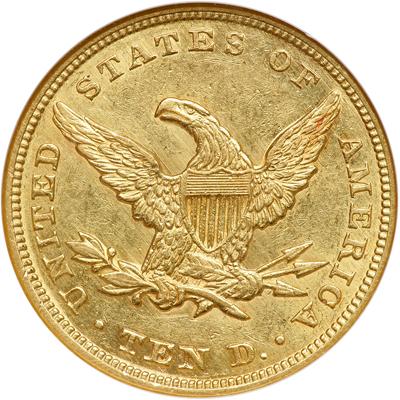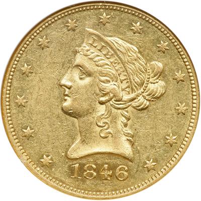 1846 $10 Liberty. NGC graded AU-58. Only 20,095 pieces struck. Wide-ranging luster spreads evenly beneath the pale golden highlights of this scarce P-mint Liberty ten, while a noticeable absence of deep circulation marks form a smooth finish across the edges of the design elements of this still frosty specimen. The strike is much more than just "adequate" in an era where uneven strikes are to be expected. Indeed, it is strong save for a limited area of lightness at stars. Low census in this elevated grade: Pop 3; 5 finer, 1 in 60, 2 in 61, 2 in 62.