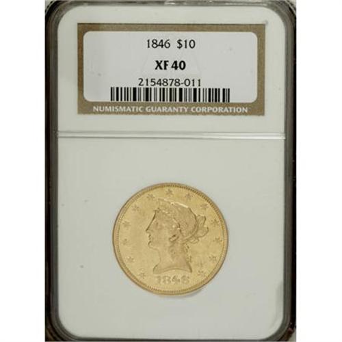 <B>1846 $10 XF40 NGC.</B></I> A low mintage issue infrequently seen in any condition. Bold and lustrous for the grade but a bit bright. The date logotypes for 1846 and 1846-O eagles were different. The 1846 has a wider date than the 1846-O, and the base of the digits are more slender.<BR><BR><B>Coin Engraver:</B> Christian Gobrecht<BR><BR><b>Shipping:</b> Coins & Currency (<a target="_blank" href="http://www.heritageauctions.com/common/shipping.php">view shipping information</a>)