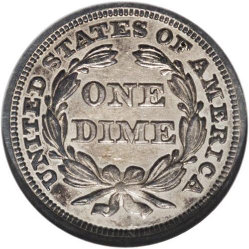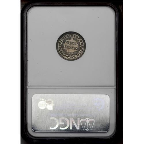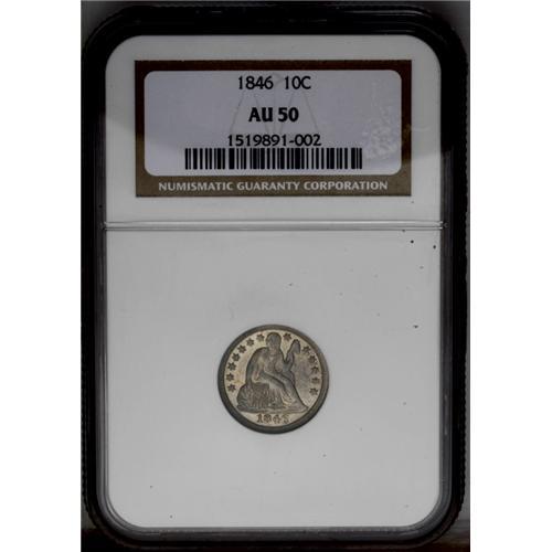<B>1846<10C> AU50 NGC.</B></I> Fortin-101. A scarce, low mintage date. The 1846 has the lowest mintage of the With Stars Obverse type. Only three pieces have been certified in AU50 (one NGC and two PCGS), with a mere 15 pieces in higher grades (the finest a pair of MS63 coins). This piece has a significant amount of mint luster surrounding the devices, and each side has an even layer of golden and gunmetal-gray toning. Just a bit softly struck over the highpoints with only the slightest abrasions present.