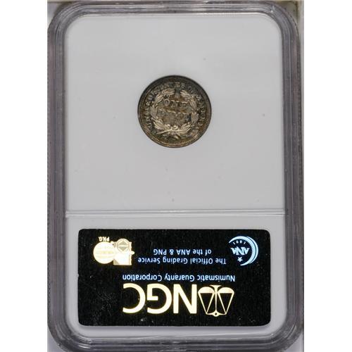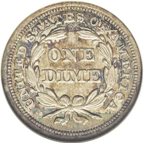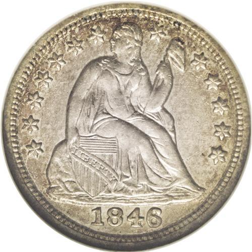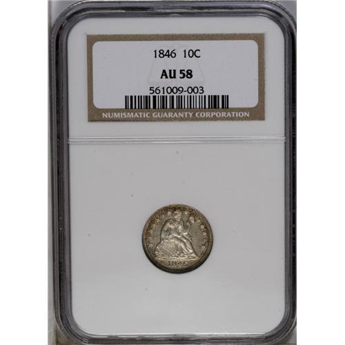 <B>1846<10C> AU58 NGC.</B></I> This is an exceptionally rare date in any grade above VG, although a small number of proof examples are also known. It seems that the middle and higher range of circulated coins are seldom seen, and Mint State examples are extremely rare. The combined population of both PCGS and NGC, for example, include just 86 coins with an average grade of approximately VF30. Keep in mind that the grading service population data is always biased toward the higher grades, and you can gain a better appreciation for the importance of this offering. This example is equal to the finest grade ever offered by NGC for this date, while two submissions at PCGS have received a higher Mint State grade, and probably represent a single coin. This is a pleasing example of the date with light silver surfaces and reflective fields. The obverse has peripheral gold toning and the reverse has splashes of gold and sky blue color. Census: 2 in 58, 0 finer (5/06).