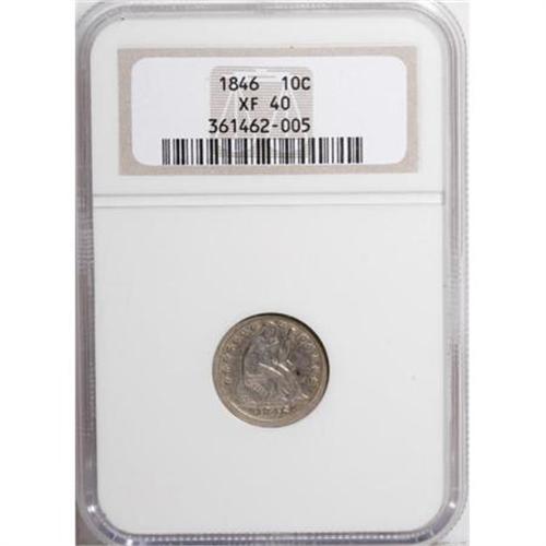 <B>1846 10C XF40 NGC.</B></I> Champagne-gold color makes occasional visits to the relatively clean surfaces of this better-date dime. Nicely detailed throughout. Census: 2 in 40, 10 finer (11/07).<BR><I>From The Casa Becca del Norté Collection.</B></I><BR><BR><B>Coin Engraver:</B> Christian Gobrecht<BR><BR><b>Shipping:</b> Coins & Currency (<a target="_blank" href="http://www.heritageauctions.com/common/shipping.php">view shipping information</a>)
