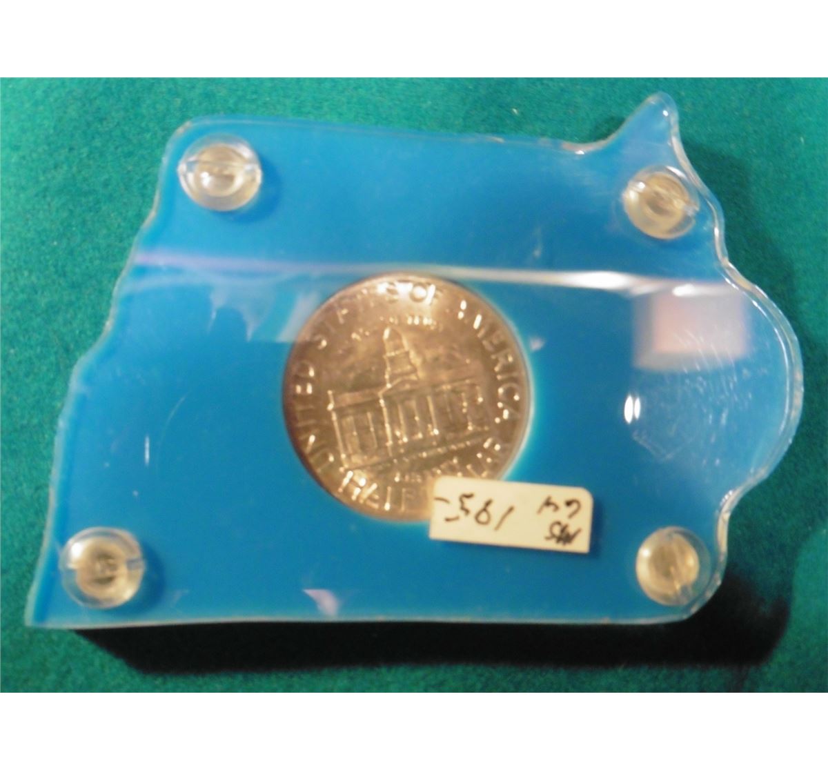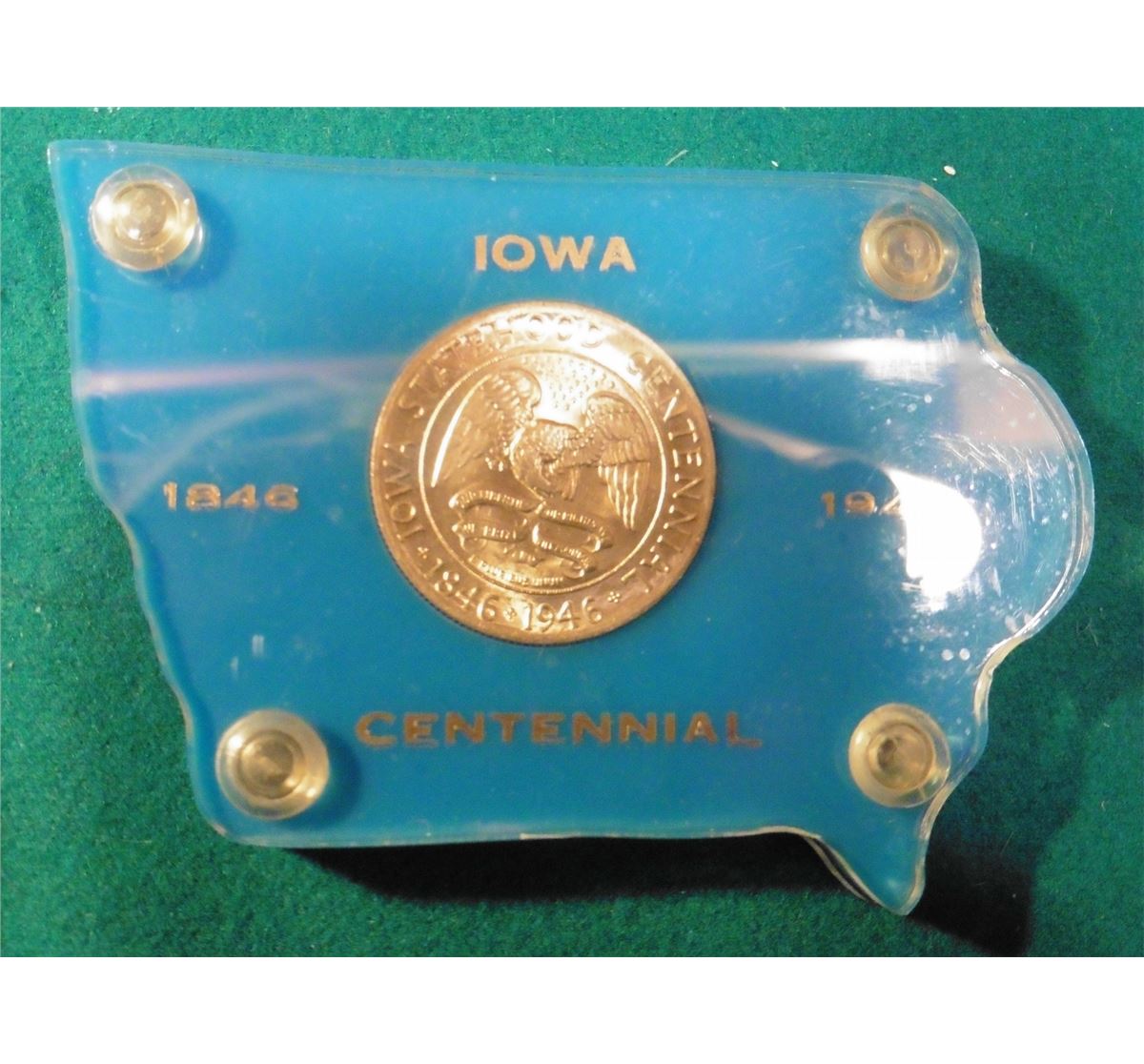 1846-1946 Iowa Centennial Commemorative Silver Half-Dollar in an Iowa map shaped Capital style holder, blue with gold-lettering. Superb Gem Unc.