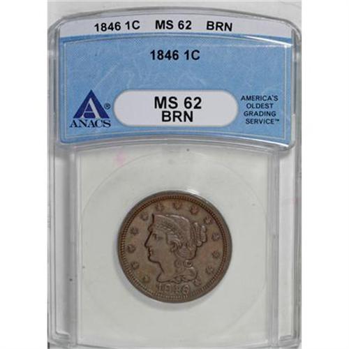 <B>1846 1C Small Date MS62 Brown ANACS.</B></I> NGC Census: (58/144). PCGS Population (14/49). Mintage: 4,120,800. Numismedia Wsl. Price for NGC/PCGS coin in MS62: $254. (#1865)<BR><BR><B>Coin Engraver:</B> Christian Gobrecht<BR><BR><b>Shipping:</b> Coins & Currency (<a target="_blank" href="http://www.heritageauctions.com/common/shipping.php">view shipping information</a>)