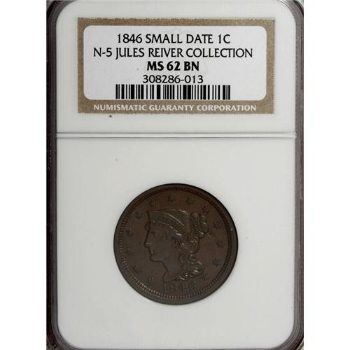 <B>1846 1C Small Date MS62 Brown NGC.</B></I> N-5, Ex: Jules Reiver Collection. NGC Census: (57/143). PCGS Population (14/49). Mintage: 4,120,800. Numismedia Wsl. Price: $254. (#1865)<BR><BR><b>Shipping:</b> Coins & Currency (<a target="_blank" href="http://www.heritageauctions.com/common/shipping.php">view shipping information</a>)