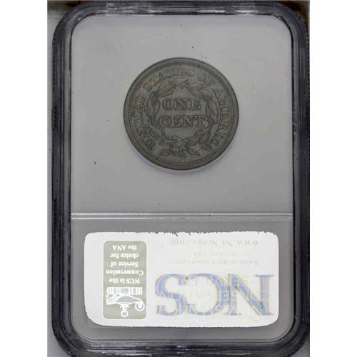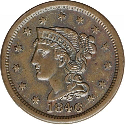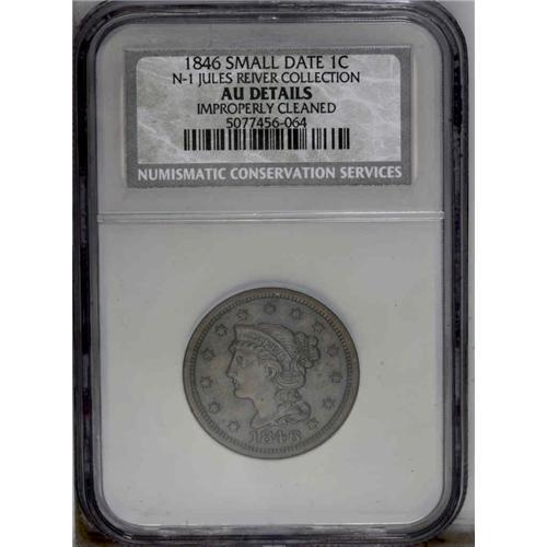 <B>1846<1C> Small Date. N-1, R.1--Improperly Cleaned--NCS. AU Details. AU50 EAC.</B></I> Grellman state c. The obverse is cracked through all of the stars, although additional cracks of state d are not visible. Olive-brown and steel with hints of pale orange around the devices, left over from the process of cleaning and recoloring this example. The reverse has blue-green color over light olive surfaces.<BR><I>Ex: George Ramont (1/3/1969).</B></I> Envelope Included.
