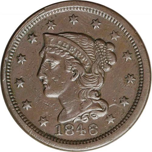 <B>1846<1C> Small Date. N-10, Low R.5--Damaged--NCS. AU Details. VF30 EAC.</B></I> Grellman state b. Two co-joined rim breaks extend from star 3 to star 6. This is apparently the terminal die state for the variety. A similarly graded example in the Brown Collection was considered fourth finest of 20 late state examples known. Pleasing medium brown with scattered abrasions, rather heavy on the obverse around Liberty's face.<BR><I>Ex: Gordon Wrubel (8/13/1969).</B></I> Envelope Included.