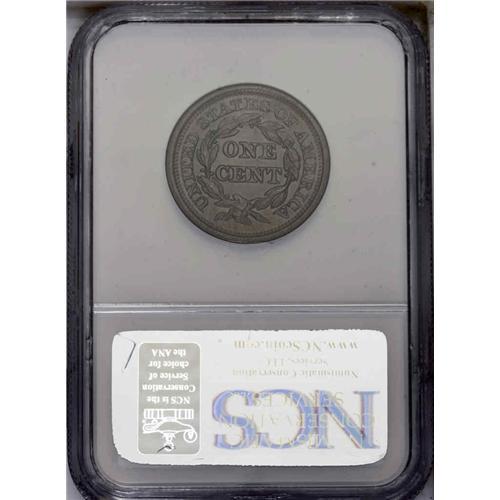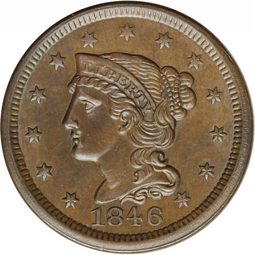 <B>1846<1C> Small Date. N-9, R.2--Improperly Cleaned--NCS. Unc Details. AU50 EAC.</B></I> Grellman state b. The vertical lines through ES are present but weak, and the arc line through ICA is similarly present but weak. Light hairlines are visible as testimony that this has been cleaned, but the surfaces have attractive olive-brown color with splashes of darker brown toning. A lovely example.<BR><I>Ex: Del Bland (10/7/1972).</B></I> Envelope Included.