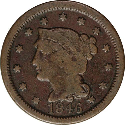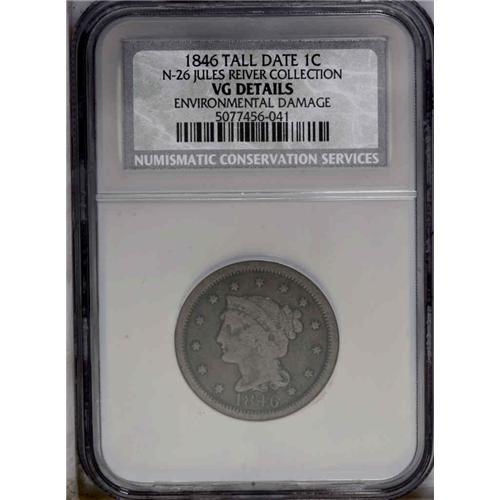 <B>1846<1C> Tall Date. N-26, High R.5--Environmental Damage--NCS. VG Details. Good 5 EAC.</B></I> Grellman state b. Reddish-brown obverse with a brown obverse. The obverse is evenly rough. Envelope Included.