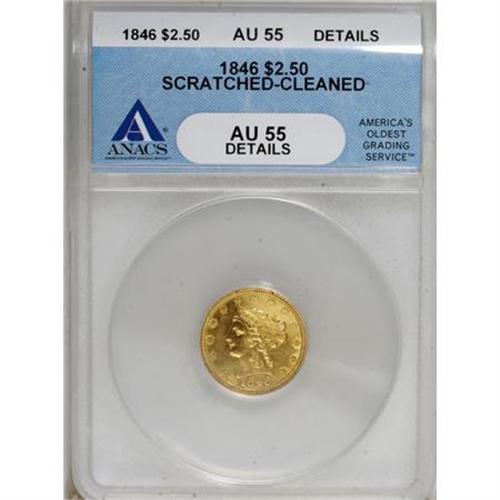 <B>1846 $2 1/2 --Cleaned, Scratched--ANACS. AU55 Details.</B></I> NGC Census: (21/52). PCGS Population (13/10). Mintage: 21,500. Numismedia Wsl. Price for NGC/PCGS coin in AU55: $1,750. (#7740)<BR><BR><B>Coin Engraver:</B> Christian Gobrecht<BR><BR><b>Shipping:</b> Coins & Currency (<a target="_blank" href="http://www.heritageauctions.com/common/shipping.php">view shipping information</a>)