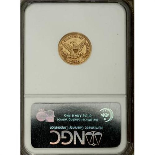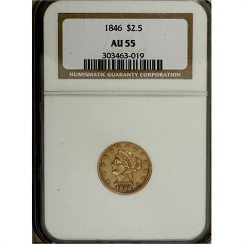<B>1846 $2 1/2 AU55 NGC.</B></I> Light cherry-red toning outlines protected areas, while the fields and devices are straw-gold. A crisply struck example with clean surfaces save for thin marks near stars 2 and 9. Only 21,598 pieces were struck. Census: 21 in 55, 53 finer (11/07).<BR><BR><B>Coin Engraver:</B> Christian Gobrecht<BR><BR><b>Shipping:</b> Coins & Currency (<a target="_blank" href="http://www.heritageauctions.com/common/shipping.php">view shipping information</a>)
