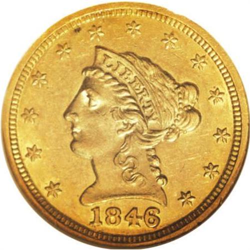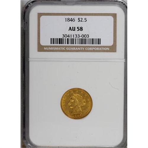 <B>1846 $2 1/2 AU58 NGC.</B></I> That fewer than 20 1846 quarter eagles have been graded as Mint State by NGC and PCGS (and none higher than MS63) indicates high-end AU coins, such as the one in this lot, are the finest most collectors can hope to acquire. Yellow-gold surfaces laced with mint-green tints retain a generous amount of luster, and are quite clean for the grade. Sharp definition adorns the design elements, save for the usual softness in the eagle's right (left facing) leg.<BR><BR><B>Coin Engraver:</B> Christian Gobrecht<BR><BR><b>Shipping:</b> Coins & Currency (<a target="_blank" href="http://www.heritageauctions.com/common/shipping.php">view shipping information</a>)