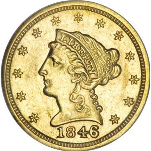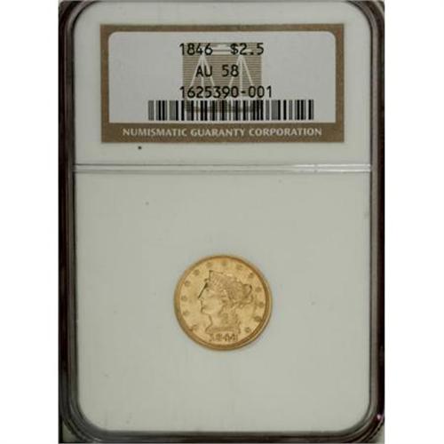 <B>1846 $2 1/2 AU58 NGC.</B></I> Well-struck (save typical softness on the eagle's facing leg), with even and pleasant peach-gold color. The 1846 is an overlooked date among early Coronet quarter eagles, with only 21,598 pieces struck and few examples set aside in high grades. There is as much luster seen on this example as on those in Mint State. Only some very light friction keeps this coin from a higher grade. Population: 2 in 58, 8 finer (11/07).<BR><BR><B>Coin Engraver:</B> Christian Gobrecht<BR><BR><b>Shipping:</b> Coins & Currency (<a target="_blank" href="http://www.heritageauctions.com/common/shipping.php">view shipping information</a>)