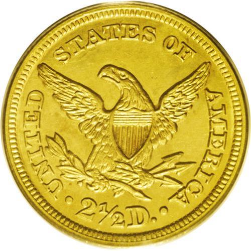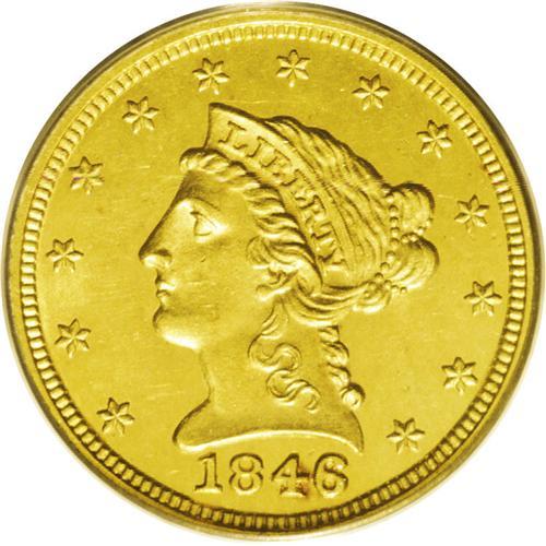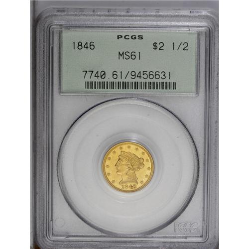 <B>1846<$2 1/2> MS61 PCGS.</B></I> This is an extraordinarily rare date in Mint State grades, from a mintage of just 21,598 coins. PCGS and NGC have only graded 17 coins in MS60 or better grades, and just four that are finer than this example. From the limited population, which include resubmissions, it is probably reasonable to estimate that no more than 10 Mint State examples of this date actually survive. This example is fully brilliant with rich yellow-gold luster and hints of green color. A few tiny copper splashes are evident on each side. The design details are fully defined and the surfaces have satiny texture with reflective fields. This is possibly the Breen-6181 variety that he called an "overdate," although it is hard to attribute this as anything more than a recut date. Population: 3 in 61, 3 finer (7/06).<BR><I>From The Derrick Snider Collection.</B></I>
