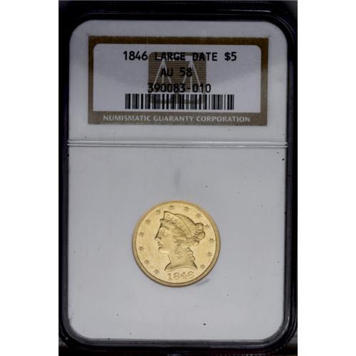 <B>1846<$5> Large Date AU58 NGC.</B></I> A flashy and sharply struck example that does not display any obvious marks. The Small Date is spaced 18 4 6, while the scarcer Large Date is spaced 1 846. From an early die state that shows repunching beneath the base of the first 1 in the date. The usually seen bisecting reverse die crack is not present.<BR><I>From The Steve Glenn Collection.</B></I> <BR><BR><B>Important notice:</B> Heritage usually auctions material at the rate of 200-250 lots per hour. On some occasions eBay Live bid software or the Internet may not be able to keep up with the pace of the auction. We recommend placing a realistic absentee bid now as insurance to avoid disappointment. Occasionally the auctioneer may eliminate or reject an eBay Live bid, and the auctioneer may also reopen a lot after the close of the eBay live bidding (usually because we missed an audience bid), and may reject your bid even if it shows you as the winning bidder. By bidding via eBay Live, you agree that Heritage may award the lot to another bidder at its sole discretion under the circumstances described above or any other reasonable circumstances. Since eBay bids are not shown to us until we open the lot on the floor, we treat those bids just like floor bids. In most cases the floor responds before the eBay bid is presented to us, due to Internet lag time, so for consistency we have made it a policy that floor bids are always considered first over tie eBay live bids. Also please note that all Heritage lots purchased through eBay Live carry a 20% Buyer's Premium. Please make sure you read the Terms and Conditions before you bid. This lot is being auctioned in conjunction with a live floor auction by Heritage Galleries & Auctioneers. All final auction and invoice information will be supplied by Heritage Galleries & Auctioneers, and all other information should be considered preliminary. Lot:2683 <BR><BR><B>Winning Notification and Billing:</B> After the FINAL session in this auction is complete, Heritage will send e-mail and snail mail invoices. This process normally takes several days. All final auction and invoice information will be supplied by Heritage Galleries & Auctioneers, and all other information should be considered preliminary. <BR><BR>This auction will be conducted on a live auction floor and over the Internet through eBay Live. If you choose to place an absentee bid, please take a moment to <font color='#0000ff'><u><a href='http://pages.ebay.com/liveauctions/help/before/laabsentee.html'>learn how eBay Live absentee bidding works</a></u></font><font color='#000000'>