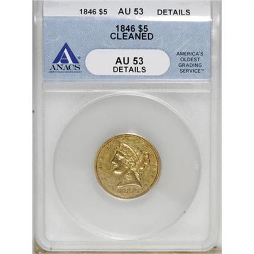 <B>1846 $5 Large Date--Cleaned--ANACS AU53 Details.</B></I> NGC Census: (28/188). PCGS Population (11/50). Mintage: 395,942. Numismedia Wsl. Price for NGC/PCGS coin in AU53: $408. (#8226)<BR><BR><B>Coin Engraver:</B> Christian Gobrecht<BR><BR><b>Shipping:</b> Coins & Currency (<a target="_blank" href="http://www.heritageauctions.com/common/shipping.php">view shipping information</a>)