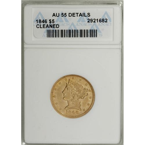 <B>1846 $5 Large Date--Cleaned--ANACS. AU55 Details.</B></I> NGC Census: (46/131). PCGS Population (24/27). Mintage: 395,942. Numismedia Wsl. Price for NGC/PCGS coin in AU55: $480. (#8226)<BR><BR><b>Shipping:</b> Coin/Currency (<a target="_blank" href="http://www.heritageauctions.com/common/shipping.php">view shipping information</a>)
