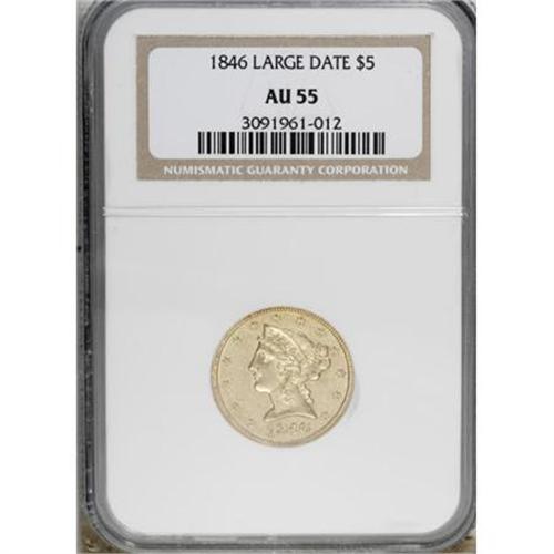 <B>1846 $5 Large Date AU55 NGC.</B></I> NGC Census: (49/135). PCGS Population (23/27). Mintage: 395,942. Numismedia Wsl. Price for NGC/PCGS coin in AU55: $480. (#8226)<BR><BR><B>Coin Engraver:</B> Christian Gobrecht<BR><BR><b>Shipping:</b> Coins & Currency (<a target="_blank" href="http://www.heritageauctions.com/common/shipping.php">view shipping information</a>)