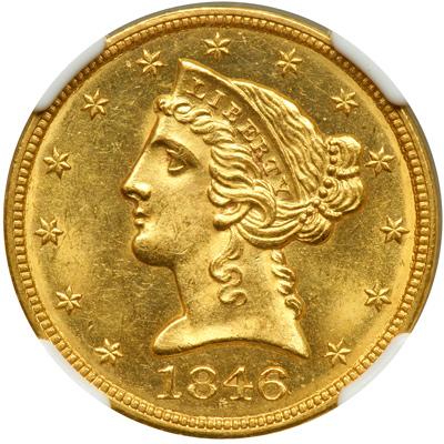 1846. Large Date. NGC graded MS-64. A gorgeous untoned example and boldly struck throughout. Highly lustrous vivid gold with traces of reflectivity on both sides interspersed with the mint frost. Considerably scarcer in Mint condition than its mintage of 395,942 pieces would lead one to expect. Most circulated; most known specimens range from Very Fine to Extremely Fine, to which can be added a scattering of About Uncirculated pieces. The present coin, graded MS-64, stands with only two others in this top grade quality among and is one of the nicest looking 1846 half eagles of which we are aware. Even the famous Harry Bass was able to locate only a Mint State 63 after years of aggressive buying. This may represent a once-in-a-decade opportunity for bidders. Pop 3; none finer (PCGS # 8226) .