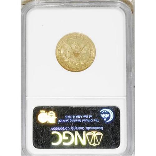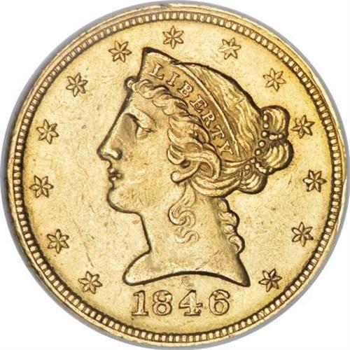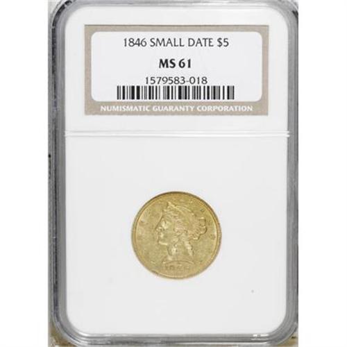 <B>1846 $5 Small Date MS61 NGC.</B></I> Two different date sizes are known for the 1846 half eagles, and the Small Date variety is slightly more plentiful. This piece has a obvious rim break on the obverse just past 3 o'clock. Lustrous surfaces exhibit pleasing greenish-gold luster. An attractive piece that is usually found in circulated grades.<BR><BR><B>Coin Engraver:</B> Christian Gobrecht<BR><BR><b>Shipping:</b> Coins & Currency (<a target="_blank" href="http://www.heritageauctions.com/common/shipping.php">view shipping information</a>)