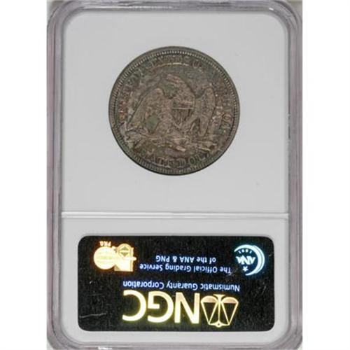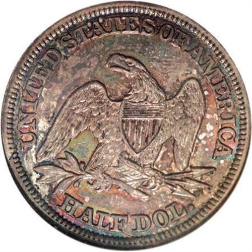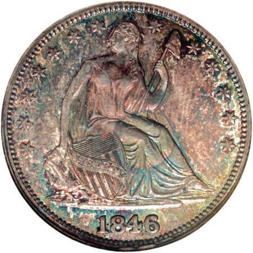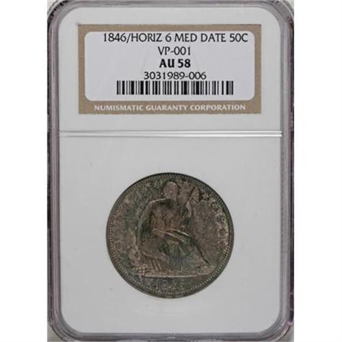 <B>1846 50C 6 Over Horizontal 6 AU58 NGC.</B></I> WB-104, VP-001. The 6 in the date is repunched over an earlier punched horizontal 6. This AU58 example has a double rim cud below 846, and there is a retained cud above UNI in UNITED, indicating an intermediate die state (Randy Wiley and Bill Bugert, 1993, p.79). Medium intensity multicolored toning covers both sides, and luster resides in the recesses. Well struck throughout. Census: 4 in 58, 8 finer (8/07).<BR><BR><B>Coin Engraver:</B> Christian Gobrecht<BR><BR><b>Shipping:</b> Coins & Currency (<a target="_blank" href="http://www.heritageauctions.com/common/shipping.php">view shipping information</a>)