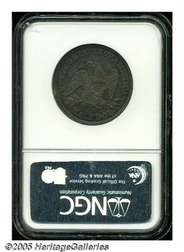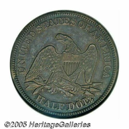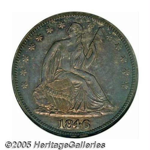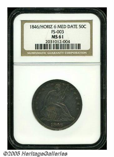 <B>1846<50C> 6 Over Horizontal 6 MS61 NGC.</B></I> FS-003, WB-104, Breen-4788. The final date digit was incorrectly punched on its side on this blundered die variety. The top of the original 6 is solidly joined to the crossbar of the adjacent 4. Additional raised die work is seen between the 8 and 4, suggesting that earlier repunching was obscured at the time this die was made. This is an intermediate die state with the double rim cud below the date clearly visible. On the reverse, a heavy die crack joins UNIT to the border, with the section above this crack loose but still present. In later die states, a full cud developed at this location. Mint State examples of this popular variety are seldom encountered. This one has satiny luster beneath heather and blue toning. Several minor scratches and abrasions in the fields prevent a higher numerical grade. This is an important opportunity for the advanced collector.