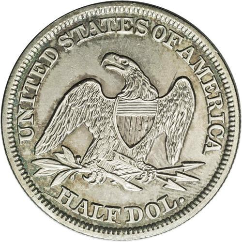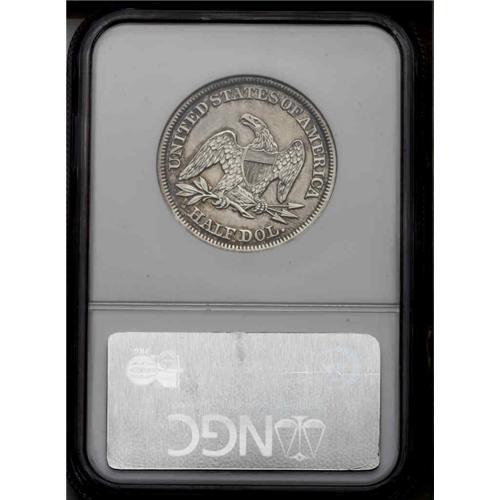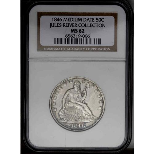 <B>1846<50C> Medium Date MS62 NGC.</B></I> Freckles of apple-green and electric-blue toning enrich the margins of this meticulously struck Seated Half. The fields possess delicate slide marks, and the reverse is curiously prooflike, but few abrasions are apparent to the unaided eye. Multiple sets of clashmarks, as struck, are encountered in the fields. Population: 19 in 62, 28 finer (8/05).