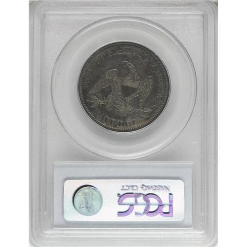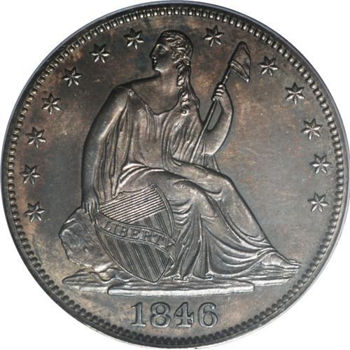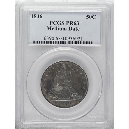 <B>1846 50C Medium Date PR63 PCGS.</B></I> WB-101. Called Small Date in some earlier texts. Today, 1846 half dollars are called Medium Date and Tall Date, with the earlier 1842 Small Date variety as a reference point. With a single exception, all proof 1846 half dollars are the Medium Date variety. A proof Tall Date coin was recently sold at auction where it was described as "possibly unique." Less than a dozen pieces are known. This example is from a different reverse die, or an earlier die state, than the Byers specimen sold by Stack's last October, and apparently also different than the Pittman coin. The Byers and Pittman coins each have fine die cracks through many of the letters on the reverse, and surprisingly, the plates of those two coins suggest a different pattern of die cracks on each. Die varieties of early proof coinage is certainly an area for much additional research. This pleasing proof has moderately reflective surfaces beneath deep magenta and iridescent toning on both sides. Every design point on each side is boldly detailed including Liberty's head and foot, all of the star centers, and the eagle's feathers and talons. Population: 3 in 63, 3 finer (1/07). PR64 is the finest grade assigned by PCGS to any 1846 proof half dollar.<BR><BR><b>Shipping:</b> Coins & Currency (<a target="_blank" href="http://www.heritageauctions.com/common/shipping.php">view shipping information</a>)