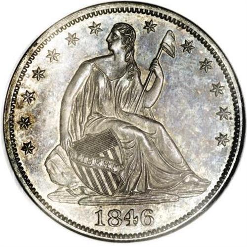 <B>1846 50C Medium Date PR65 NGC.</B></I> Ex: Pittman-Kaufman. The 1846 half dollar is rare in proof format. The Kaufman specimen, earlier from the famous Pittman Collection, is considered by most knowledgeable numismatists to be the finest known example.<BR> The half dollar of this year displays two date sizes-Medium Date and Large Date. The two varieties are easily distinguished by inspection of the 4 in the date. The Medium Date 4 is connected between the lower serif of the crossbar and the base, whereas the Large Date 4 has a noticeable separation in this area. <BR> Wiley and Bugert (1993) indicate that less than 10 Medium Date proofs are known, and that the number of Large Date proofs is unknown. Breen (1989), on the other hand, lists seven Medium Date proofs and one Large (or Tall) Date. Of the latter he says: "I saw this coin about 1953, attributed it as Beistle 5-C, but have no record of its present location." <BR> David Akers, cataloging John Jay Pittman's 1846 proof set for the May 20-21 sale dates, suggests that 10 to 12 examples of the half dollar coin are extant. Interestingly, NGC/PCGS population data for this issue deviate significantly from estimates provided by the foregoing researchers, as the two services have seen a total of 22 1846 proof half dollars. NGC has certified two PR65 examples, two in PR64, four PR63s, and three PR62s; PCGS has graded three each in PR64, PR63, and PR62, and two specimens as PR61. In all likelihood, a fair number of the certified pieces are resubmissions.<BR> The following roster of 1846 proof half dollars is based on the review of plated catalogs available to us:<BR><BR><B> 1. PR65 NGC. The Pittman-Kaufman coin.</B></I> This is the only certified PR65 that we are able to identify. As such, we feel that the Kaufman specimen is probably the finest known.<BR><B> 2. PR64 NGC. </B></I>Phil Kaufman; Bowers and Merena (8/1999), lot 202; Superior (10/2000), lot 4374.<BR><B> 3. PR63 PCGS.</B></I> Stack's (6/1999), lot 2222. Catalogers say of this "Tall Date" example: "Possibly unique as Proof"; George "Buddy" Byers Collection (Stack's, 10/2006), lot 1138.<BR><B> 4. PR63 NGC.</B></I> Central States (Heritage, 5/2005), lot 7208. Catalogers say: "A thin ... scratch is seen laterally across the obverse resulting in the PR63 grade."<BR><B> 5. PR63 SEGS.</B></I> Heritage (1/2002 FUN Sale), lot 6997; Rarities Sale (Bowers and Merena, 7/2005), lot 552.<BR><B> 6. PR61.</B></I> The Louis E. Eliasberg, Sr. Collection (Bowers and Merena, 4/1997), lot 1935.<BR><B> 7. Proof.</B></I> Smithsonian Institution.<BR><BR>Additional Examples:<BR> A. PR65. Bowers and Merena (9/1988), lot 201.<BR> B. PR63 PCGS. Heritage (2/2007), lot 3509.<BR> C. Brilliant Proof. The Winter Collection (Stack's, 1-2/1974), lot 1440. Catalogers say: "From a Paramount Fixed Price offering and then sold as lot 744 in Lester Merkin's Feb. 1971 Sale." <BR><BR> The Gem we present in this lot is an extremely attractive example, made so by rich medium-intensity toning, a powerful strike, and nicely preserved surfaces. A medley of sky-blue, russet, and lavender occupies both sides, but does not diminish the field-motif contrast when the piece is rotated under a light source. Bold definition characterizes all of the design elements. Indeed, close examination reveals no areas with even the slightest hint of weakness. A couple of grade-consistent marks aid in the identification of the coin, including minute contact in the field to the left of star 11 and a faint line above TATE of STATES. Proof halves of 1846 do not appear at auction all that frequently, so the connoisseur of early Seated Liberty proofs will want to give special attention to this delightful specimen.<BR><I>From The Phil Kaufman Collection of Early Seated Proof Sets, Part Three.</B></I><BR><BR><B>Coin Engraver:</B> Christian Gobrecht<BR><BR><b>Shipping:</b> Coins & Currency (<a target="_blank" href="http://www.heritageauctions.com/common/shipping.php">view shipping information</a>)