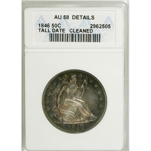 <B>1846 50C Tall Date--Cleaned--ANACS. AU58 Details.</B></I> NGC Census: (0/0). PCGS Population (1/11). (#6252)<BR><BR><b>Shipping:</b> Coins & Currency (<a target="_blank" href="http://www.heritageauctions.com/common/shipping.php">view shipping information</a>)