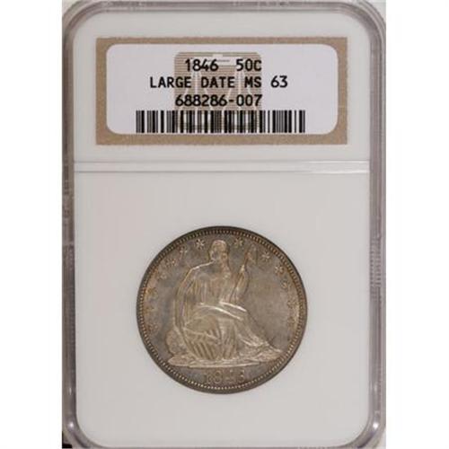 <B>1846 50C Tall Date MS63 NGC.</B></I> Breen-4790, WB-108. The 4 in the date has a spike from the crosslet. Designated as Large Date by NGC, which is equivalent to Tall Date but different than the squat Medium Date. Well struck with medium autumn-gold toning and a few minor marks on the right obverse field.<BR><BR><B>Coin Engraver:</B> Christian Gobrecht<BR><BR><b>Shipping:</b> Coins & Currency (<a target="_blank" href="http://www.heritageauctions.com/common/shipping.php">view shipping information</a>)