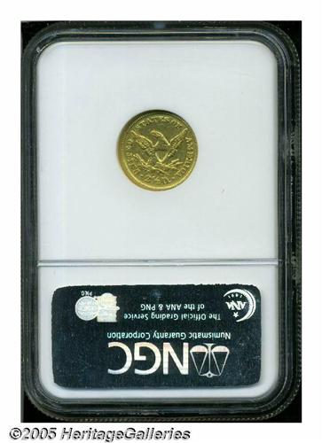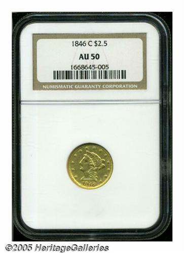 <B>1846-C<$2 1/2> AU50 NGC.</B></I> Variety 7-F. Like so many others, this is an elusive low-mintage date. Just 4,808 were coined and today, only about 70 examples survive in all grades. Despite higher population records, only about a dozen finer examples are known. Light yellow-gold with minor abrasions consistent with the grade. Population: 6 in 50, 22 finer (5/05).
