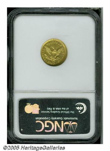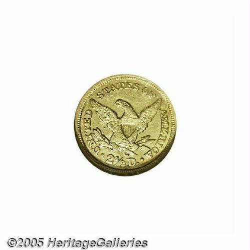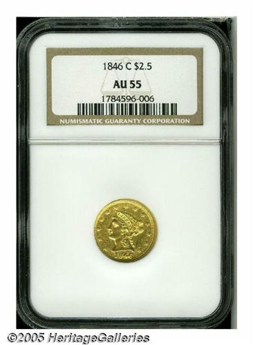 <B>1846-C<$2 1/2> AU55 NGC.</B></I> Variety 7-F. Doug Winter rated this issue as the fourth rarest Charlotte quarter eagle, and the second rarest in high grade. Mintage for this issue was pegged at 4,808 coins, and less than 2% survive today. Doug Winter summed up this issue with the following commentary: "The 1846-C is a very scarce coin in all grades. Over three quarters of the known survivors grade below Extremely Fine and an accurately graded Extremely Fine-45 example is quite rare. This date is very rare in About Uncirculated. There are more Uncirculated pieces in existence than generally believed and, ironically, the collector is about as likely to be offered a Mint State coin as a choice About Uncirculated. However, it is still extremely rare." Winter went on to record five Mint State examples and between six and eight AUs. Because Choice AU examples are equally as rare as Mint State coins, yet not nearly as expensive, this offering provides an exceptional opportunity for the advanced collector. The surfaces are light yellow-gold with minor abrasions as expected for the grade, and the fields seem to be slightly reflective. The obverse has weak star details and much of the reverse is weakly defined. As a result, only the slightest hint of wear immediately brought this coin down to the 55 grade level. It is likely that this quarter eagle was only involved in a few transactions, just enough to eliminate the lustrous appearance from the high points of the design.