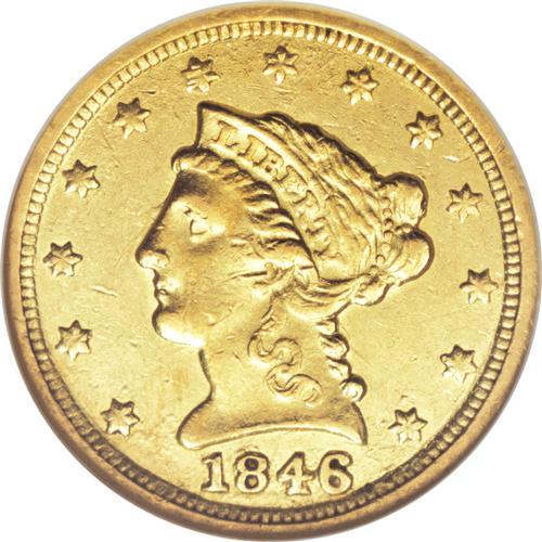<B>1846-C $2 1/2 AU55 NGC.</B></I> Variety 7-F. This luminous sun-gold Charlotte Mint example has few marks, and the strike is good save for typical merging of detail on the eagle's body. A mere 4,808 pieces were struck, and the numismatic significance of survivors went unappreciated until many decades later. Census: 15 in 55, 15 finer (4/07).<BR><BR><b>Shipping:</b> Coins & Currency (<a target="_blank" href="http://www.heritageauctions.com/common/shipping.php">view shipping information</a>)