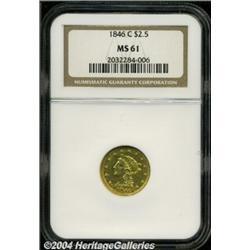 <B>1846-C<$2 1/2> MS61 NGC.</B></I> Variety 7-F. The '46-C is one of the premier rarities in the Charlotte series of quarter eagles, ranking fourth of the 20 issues in overall rarity and second in high grade rarity. Only 4,808 pieces were struck and it is reliably estimated that today only 65-75 coins are known, three-quarters of which are VF or lower. This is one of the few Uncirculated coins known and it is a lower Condition Census example, being tied with at least two other pieces at the MS61 grade level. Better struck on the obverse than the average '46-C, the reverse is soft, as usual. The green-gold surfaces show just the slightest hint of reddish patina on each side and there are no mentionable abrasions present. There are, however, two areas of what appear to be either planchet roughness or die clashing on the reverse above the eagle's wings. <BR><BR><B>Important notice:</B> Heritage usually auctions material at the rate of 200-250 lots per hour. On some occasions eBay Live bid software or the Internet may not be able to keep up with the pace of the auction. We recommend placing a realistic absentee bid now as insurance to avoid disappointment. Occasionally the auctioneer may eliminate or reject an eBay Live bid, and the auctioneer may also reopen a lot after the close of the eBay live bidding (usually because we missed an audience bid), and may reject your bid even if it shows you as the winning bidder. By bidding via eBay Live, you agree that Heritage may award the lot to another bidder at its sole discretion under the circumstances described above or any other reasonable circumstances. Since eBay bids are not shown to us until we open the lot on the floor, we treat those bids just like floor bids. In most cases the floor responds before the eBay bid is presented to us, due to Internet lag time, so for consistency we have made it a policy that floor bids are always considered first over tie eBay live bids. Also please note that all Heritage lots purchased through eBay Live carry a 20% Buyer's Premium. Please make sure you read the Terms and Conditions before you bid.
