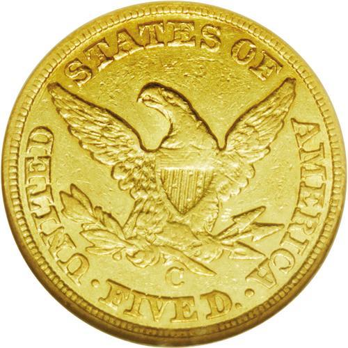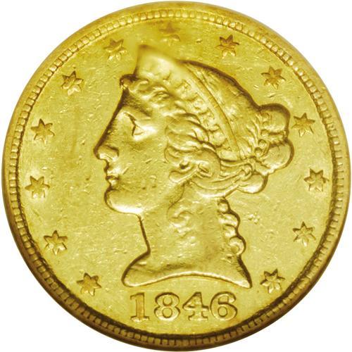 <B>1846-C<$5> AU50 NGC.</B></I> Variety 8-E. The 1846-C, with a mintage of 12,995 pieces, is scarce above the XF level. The AU50 specimen offered in this lot displays bright yellow-gold surfaces with traces of luster in the protected areas. The design elements are generally well defined, though some softness is noted in portions of the center on each side. A few of the expected contact marks are scattered about.