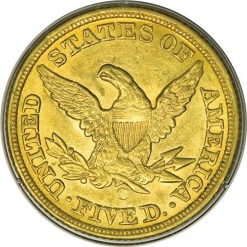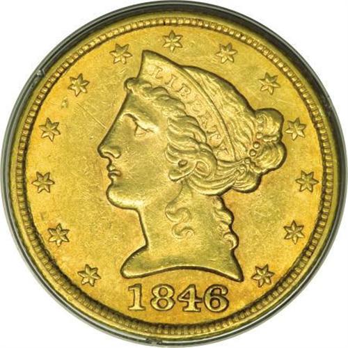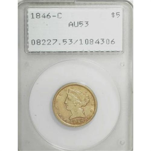 <B>1846-C $5 AU53 PCGS.</B></I> Variety 8-E. Well struck with full detail on the obverse and reverse; there is no weakness on the eagle's neck as seen on many 1846-C half eagles. The surfaces are choice with no discernible marks or hairlines. The luster is nearly full and it has a rich frosty texture. There are not many fully original 1846-C half eagles left but those that remain are known for their excellent color ... as on this coin. There are superb rich yellow-gold hues at the obverse border while the reverse is a bit more even in its coloration. This is an exceptional coin that is attractive and completely original. It is, in fact, the type of Charlotte half eagle that is almost never seen any more. Housed in an old PCGS holder and choice for the grade.<BR> The 1846-C is among the four or five scarcest half eagles from this mint in terms of overall rarity. It seems more available in AU than in the past but properly graded coins in the AU53 to 55 range are rare and 58s are very rare. There are as many as five or six Uncirculated pieces known with the finest still the lovely Dingler/Eliasberg coin which is graded MS63 by PCGS.<BR><I>From The Carolina Circle Collection.</B></I><BR><BR><B>Coin Engraver:</B> Christian Gobrecht<BR><BR><b>Shipping:</b> Coins & Currency (<a target="_blank" href="http://www.heritageauctions.com/common/shipping.php">view shipping information</a>)