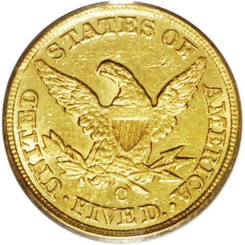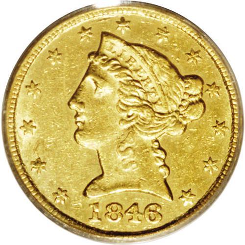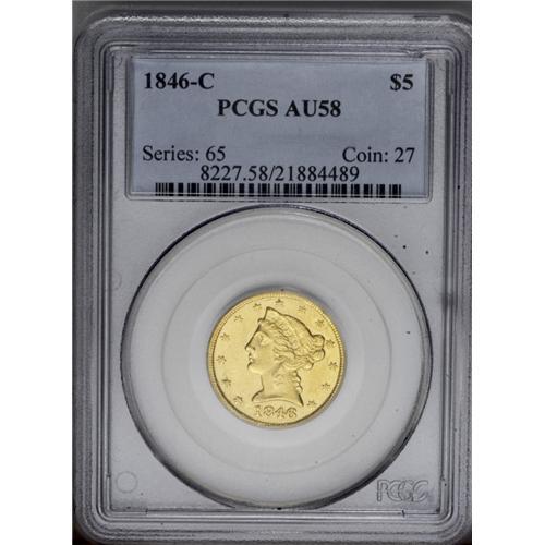 <B>1846-C<$5> AU58 PCGS.</B></I> Variety 8-E. Only 12,995 half eagles were struck in Charlotte in 1846, and since just a handful of pieces have survived in Mint State, near-Mint examples are important to the specialist. This partly lustrous and moderately marked piece has a decidedly above average strike, although the definition is not quite full on the shield or hair curls. Repunching is visible beneath the 1 in the date and within the loop of the 4. Population: 6 in 58, 5 finer (3/06). <BR><BR><B>Important notice:</B> Heritage usually auctions material at the rate of 200-250 lots per hour. On some occasions eBay Live bid software or the Internet may not be able to keep up with the pace of the auction. We recommend placing a realistic absentee bid now as insurance to avoid disappointment. Occasionally the auctioneer may eliminate or reject an eBay Live bid, and the auctioneer may also reopen a lot after the close of the eBay live bidding (usually because we missed an audience bid), and may reject your bid even if it shows you as the winning bidder. By bidding via eBay Live, you agree that Heritage may award the lot to another bidder at its sole discretion under the circumstances described above or any other reasonable circumstances. Since eBay bids are not shown to us until we open the lot on the floor, we treat those bids just like floor bids. In most cases the floor responds before the eBay bid is presented to us, due to Internet lag time, so for consistency we have made it a policy that floor bids are always considered first over tie eBay live bids. Also please note that all Heritage lots purchased through eBay Live carry a 20% Buyer's Premium. Please make sure you read the Terms and Conditions before you bid. This lot is being auctioned in conjunction with a live floor auction by Heritage Galleries & Auctioneers. All final auction and invoice information will be supplied by Heritage Galleries & Auctioneers, and all other information should be considered preliminary. Lot:2686 <BR><BR><B>Winning Notification and Billing:</B> After the FINAL session in this auction is complete, Heritage will send e-mail and snail mail invoices. This process normally takes several days. All final auction and invoice information will be supplied by Heritage Galleries & Auctioneers, and all other information should be considered preliminary. <BR><BR>This auction will be conducted on a live auction floor and over the Internet through eBay Live. If you choose to place an absentee bid, please take a moment to <font color='#0000ff'><u><a href='http://pages.ebay.com/liveauctions/help/before/laabsentee.html'>learn how eBay Live absentee bidding works</a></u></font><font color='#000000'>