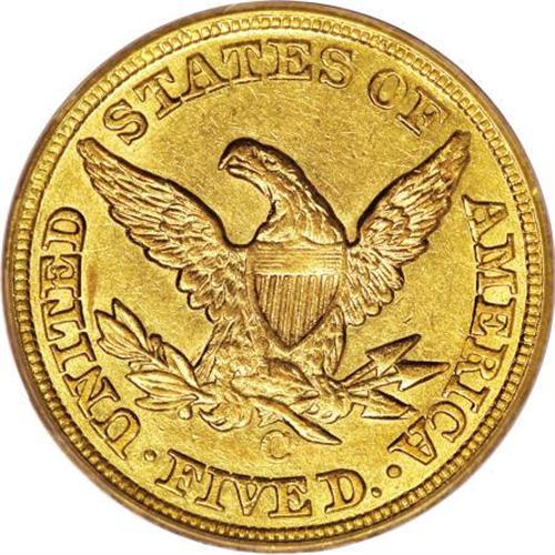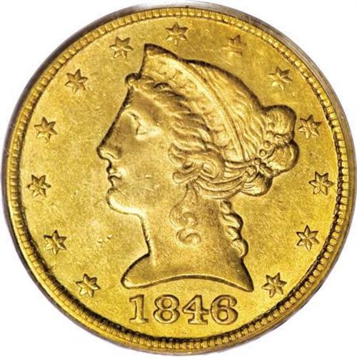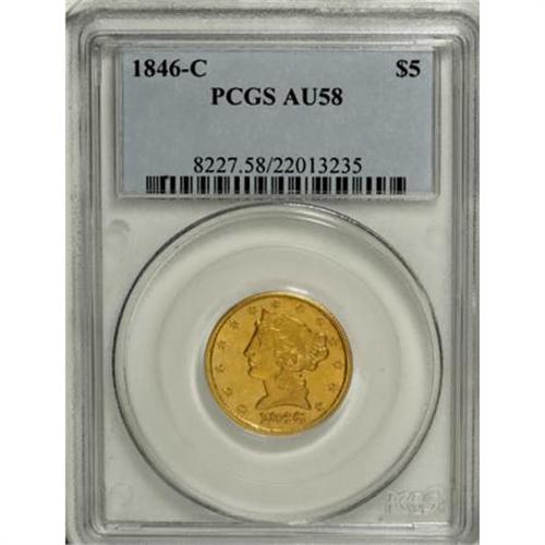 <B>1846-C $5 AU58 PCGS.</B></I> Variety 8-E, the only confirmed variety of the date. Satiny fields exhibit a hint of reflectivity beneath rich honey-gold obverse color and lighter green-gold reverse color. Nearly full luster is broken only on the highest design points and the surfaces are lightly abraded.<BR><BR><B>Coin Engraver:</B> Christian Gobrecht<BR><BR><b>Shipping:</b> Coins & Currency (<a target="_blank" href="http://www.heritageauctions.com/common/shipping.php">view shipping information</a>\)