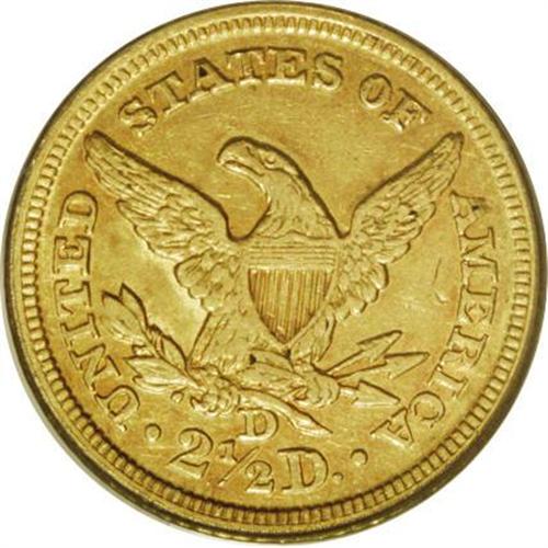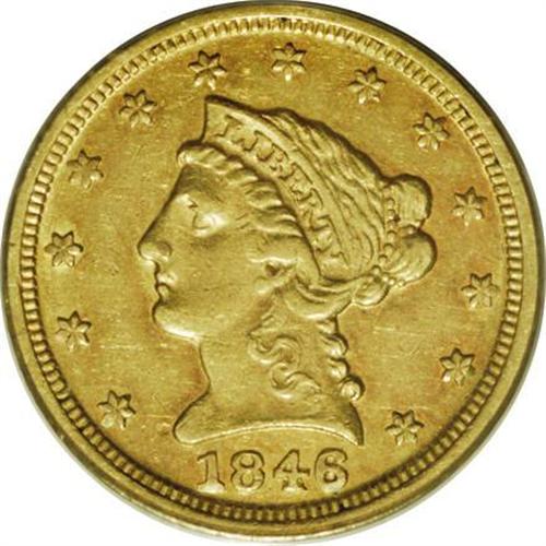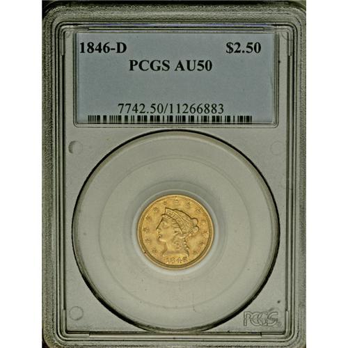 <B>1846-D $2 1/2 AU50 PCGS.</B></I> Variety 7-H. The 1846-D quarter eagle is not particularly rare although the uninitiated might look at the mintage of 19,303 coins and think otherwise. However, the reality is that this mintage is actually the third <I>largest</B></I> mintage of any Dahlonega quarter eagle date. This piece has rich green-gold color with hints of orange toning. While the surfaces are lightly hairlines, the quality of this example is excellent.<BR><BR><b>Shipping:</b> Coins & Currency (<a target="_blank" href="http://www.heritageauctions.com/common/shipping.php">view shipping information</a>)