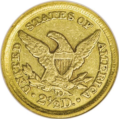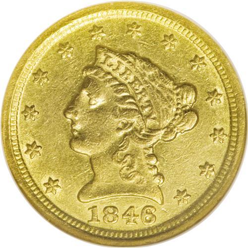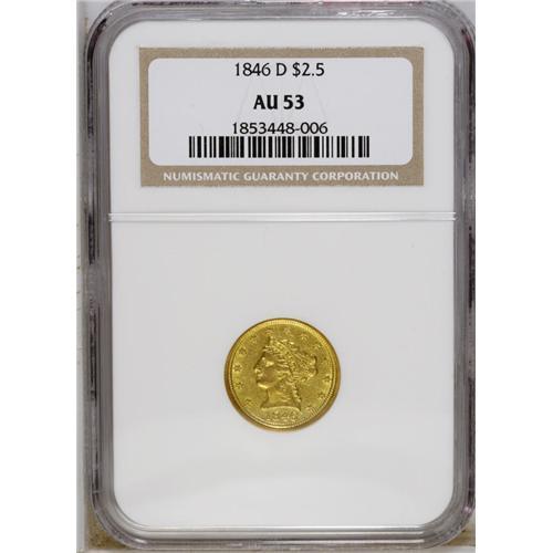<B>1846-D $2 1/2 AU53 NGC.</B></I> Variety 7-K. The mintage of the 1846-D was low and surviving examples are also scarce with only 175-200 pieces believed known today in all grades. This piece is certainly better-than-average by degree of wear, but it shows the numerous small abrasions and central striking softness seen on most examples of this issue.<BR><BR><b>Shipping:</b> Coin/Currency (<a target="_blank" href="http://www.heritageauctions.com/common/shipping.php">view shipping information</a>)
